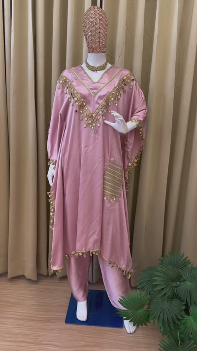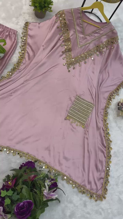 Kaftan set, satin kaftan online, embroidered kaftan, mirror work kaftan, kaftan with pant, party wear kaftan set, luxury kaftan dress, festive kaftan online, designer kaftan set India